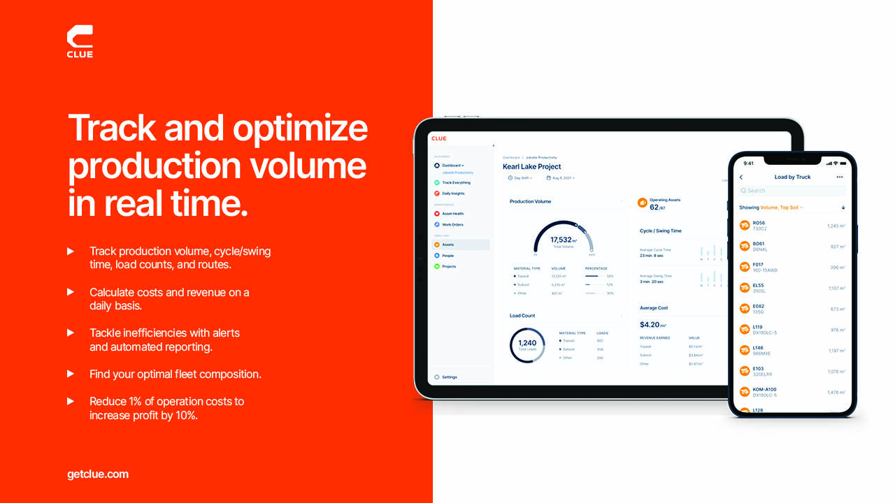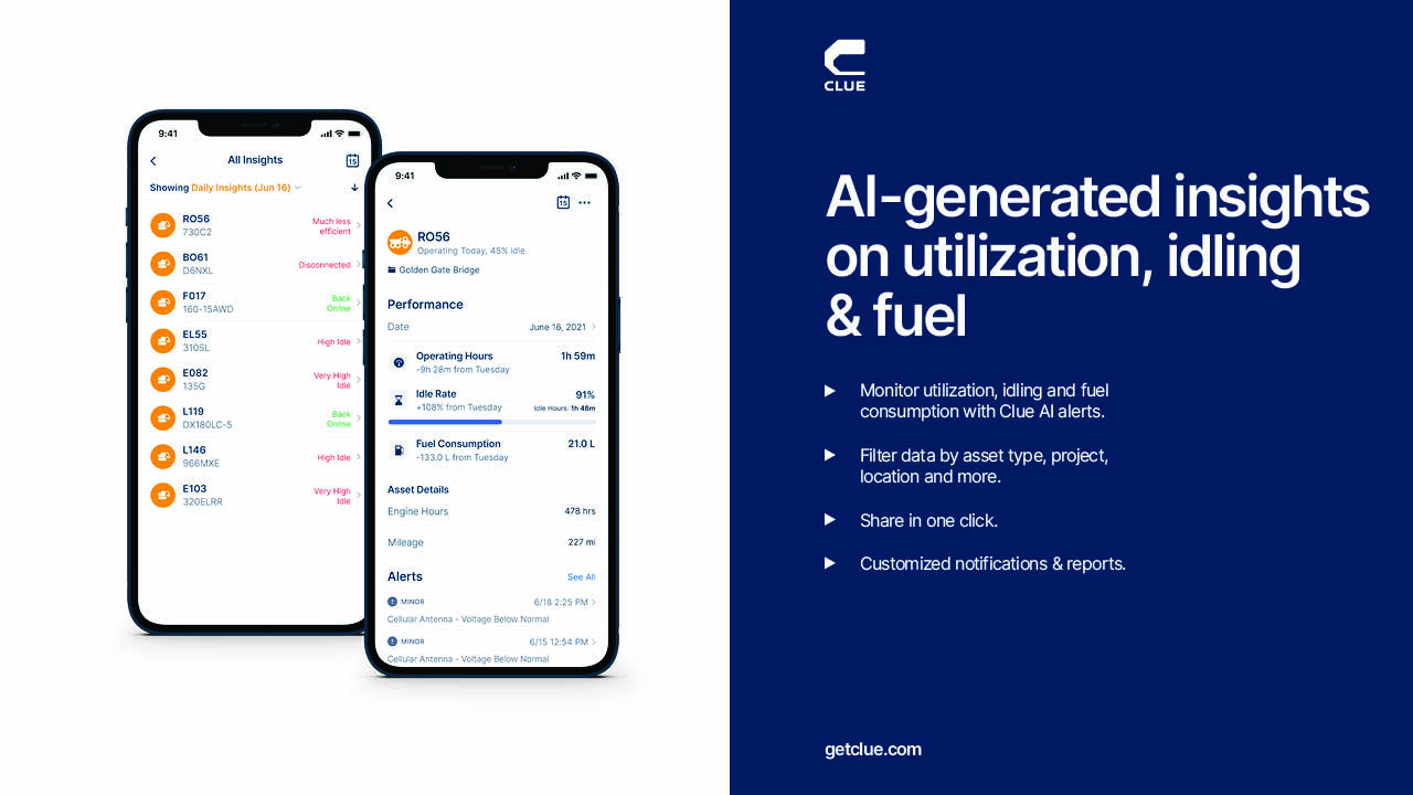 Clue is the first fully integrated solution to digitize, connect and optimize all aspects of construction fleet operations - off-road, on-road, tools and crew - in a single platform. Powered by AI and robust telematics integrations, Clue provides operations and fleet managers actionable data, a single ‘source of truth’ and a centralized place to manage their entire fleet operation.