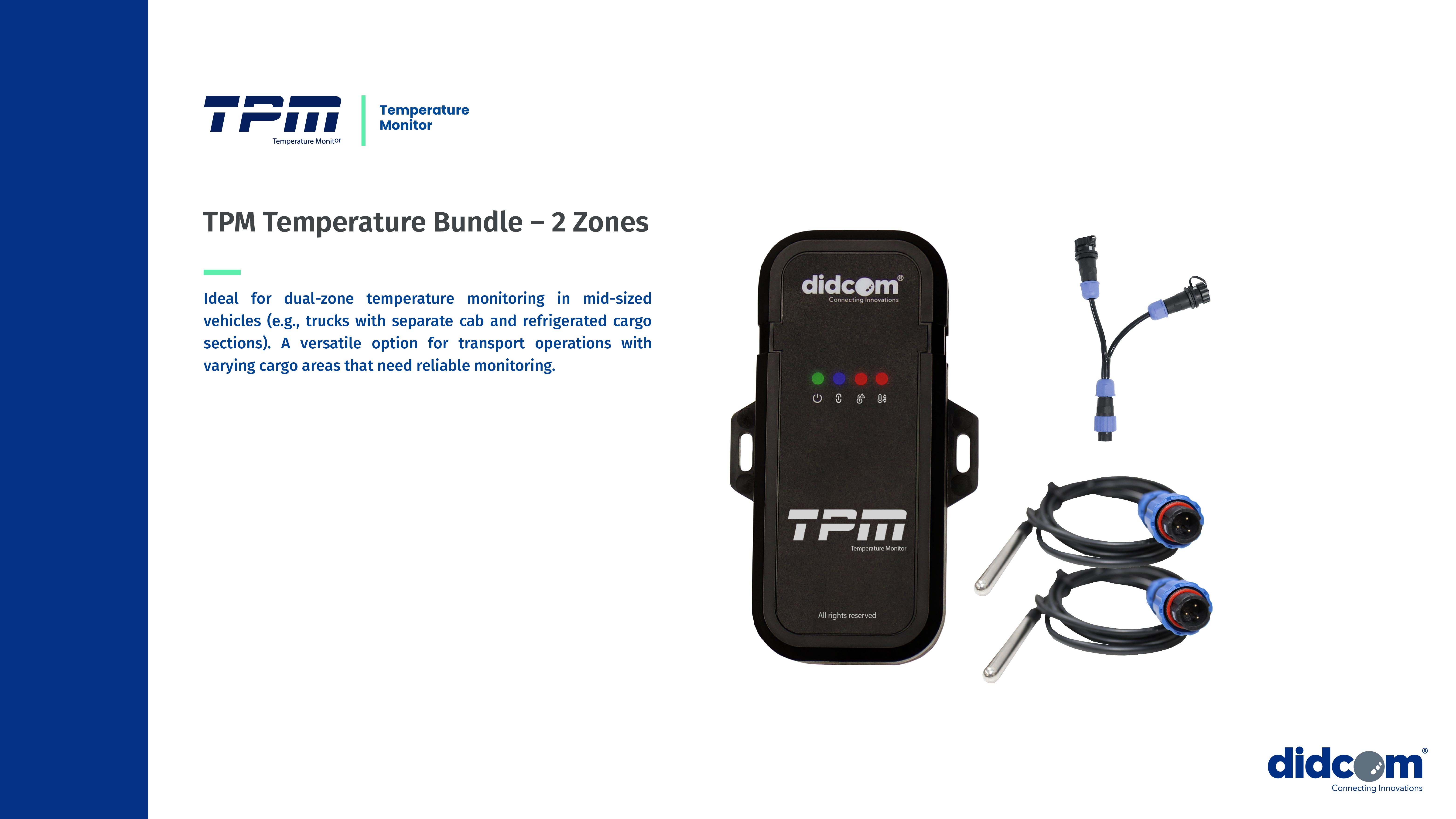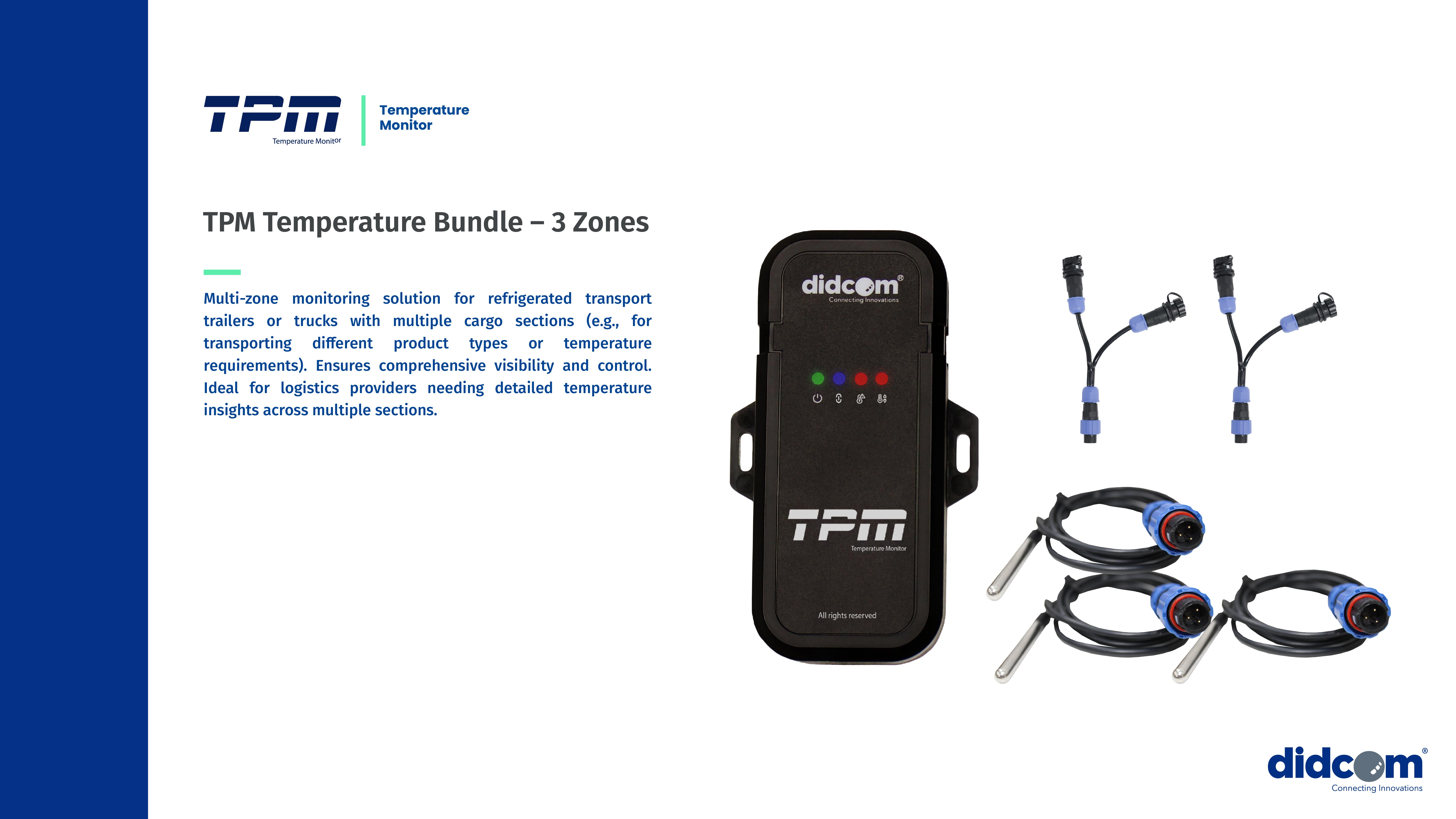With heavy-duty industrial connectors and multi-zone monitoring capabilities, this advanced system delivers high durability and reliability for demanding operations, ensuring precise temperature tracking for multi-compartment refrigeration and long-haul transport, helping businesses maintain product quality, meet compliance standards and optimize operational efficiency.