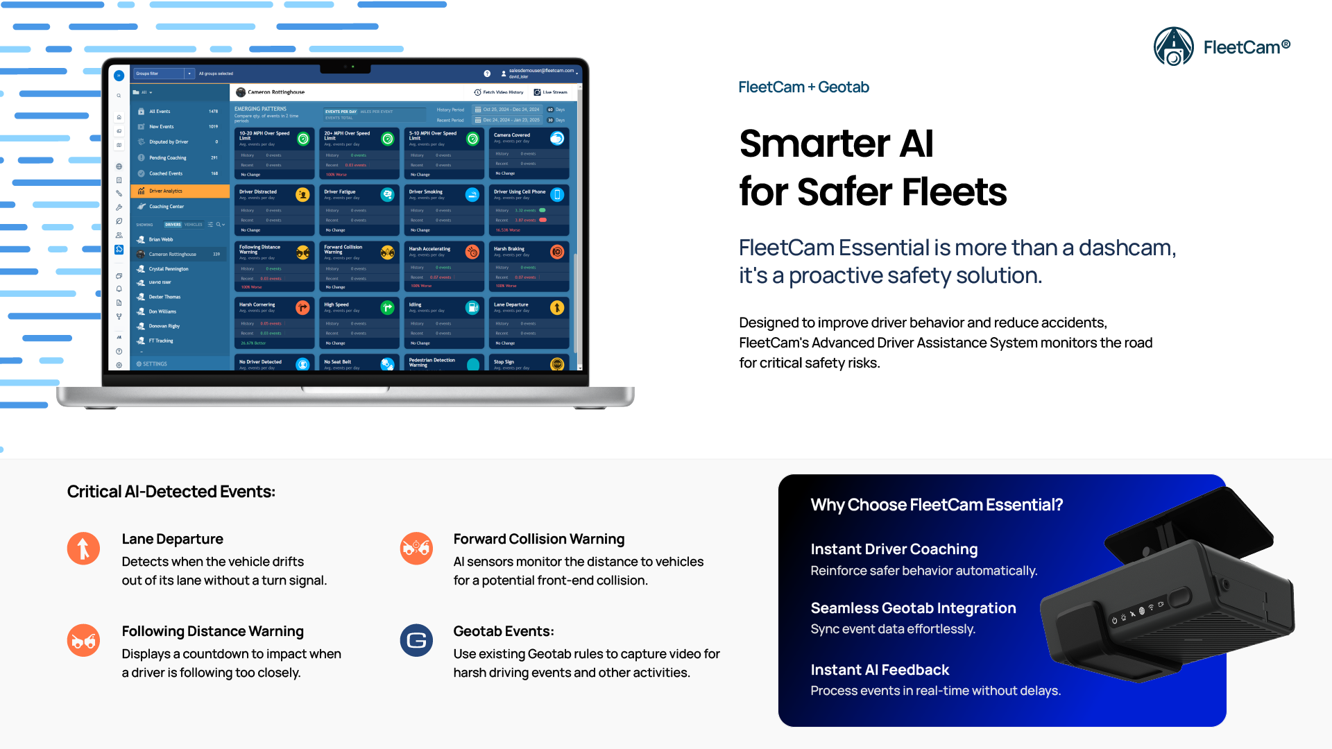 - MyGeotab add-in integration offers full FleetCam suite of driver behavior analytics, driver scorecards, events, live-stream, remote wake, alerts, and facial recognition