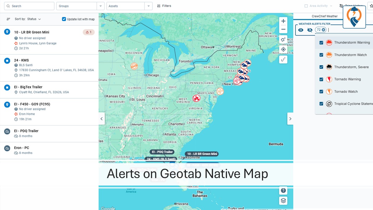 Weather is the #1 variable impacting the on-time, and safe, delivery of products and services. Integrated weather with Geotab location data enables dispatchers to make real-time decisions in ways never before possible. Better decisions improve safety and profitability. Better decisions begin with CrewChief Critical Weather.